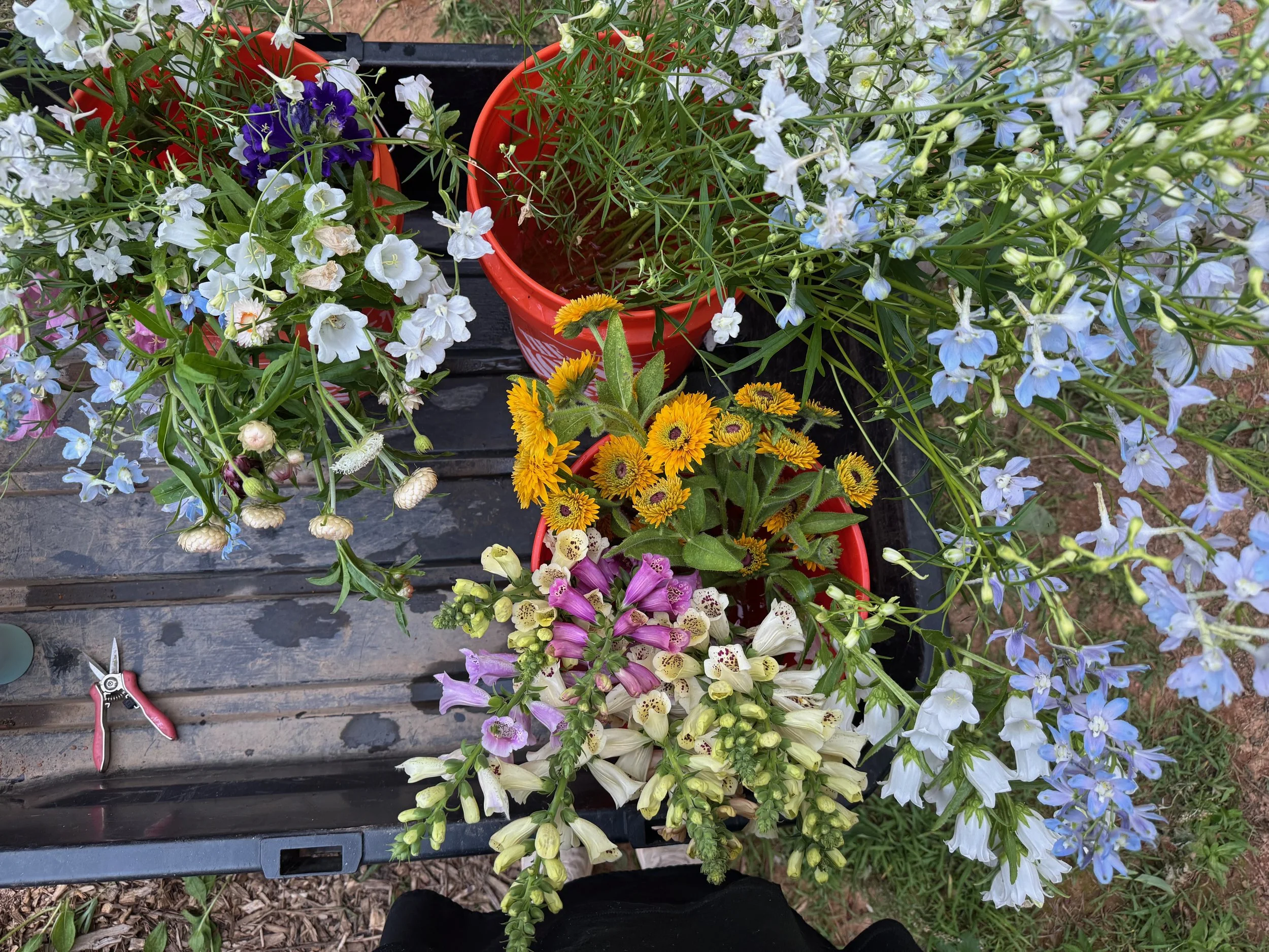 Tar Heel Flowers started as a hobby flower farm on our postage stamp of a yard in 2023. We quickly realized that Tyler was incapable of having a casual hobby, and started selling our flowers to offload the surplus. In 2024, we moved to a much bigger lot in Hillsborough, where we have more room to grow flowers and raise our family.